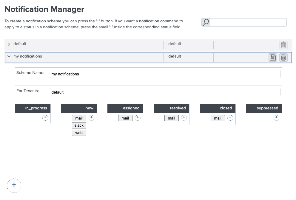 Pressing the add button creates a new scheme. We can add multiple Notification Commands for each status available. Within the notification command, select the Channel and then configure the rest of the options.