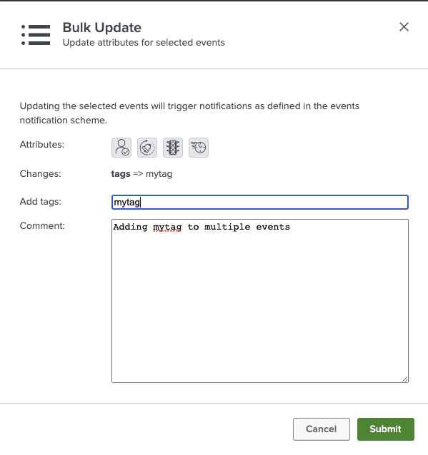 A user can also apply tags to multiple events using the "bulk edit" action. Note for users of the old Alert Manager app: this replaces the grouping functionality.