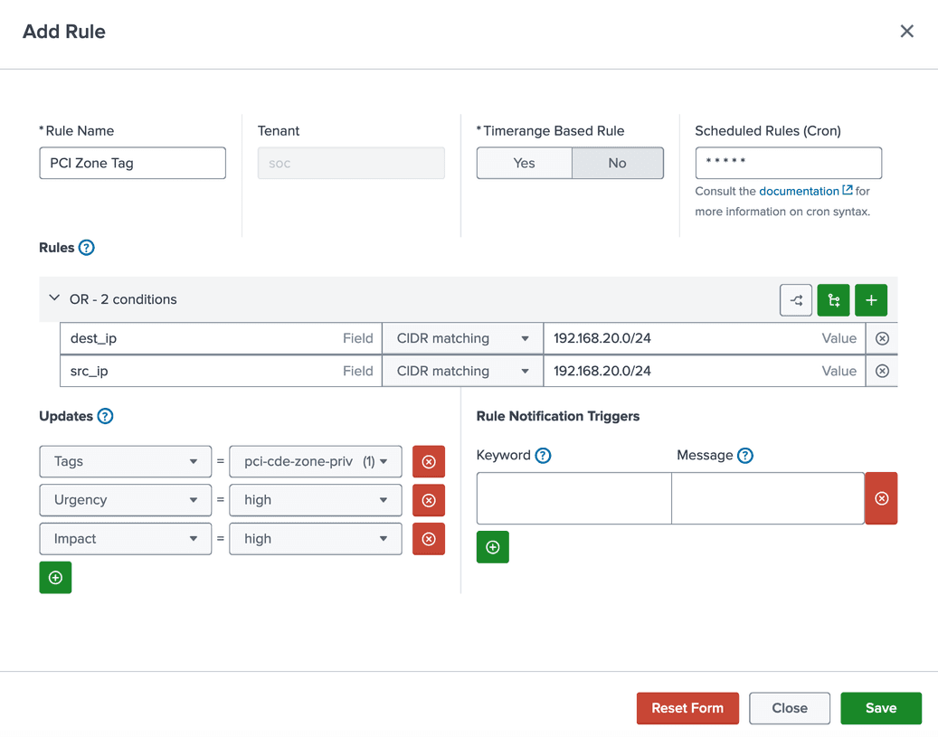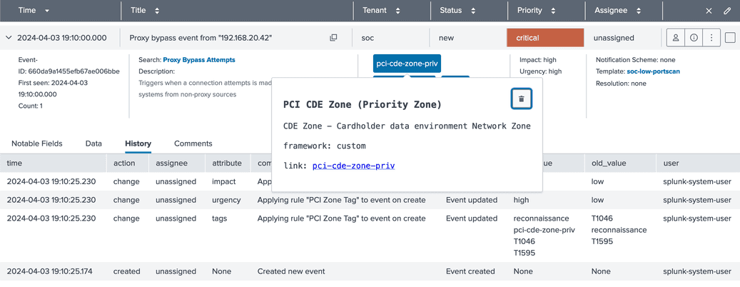 Properly handling events based on the originating PCI zone is imperative in scenarios requiring PCI compliance. A simple rule can assign a tag to an event if it originates from or is destined to a PCI zone, utilizing source or destination IP addresses. This facilitates setting appropriate impact and urgency levels for events associated with the Cardholder Data Environment (CDE) network.