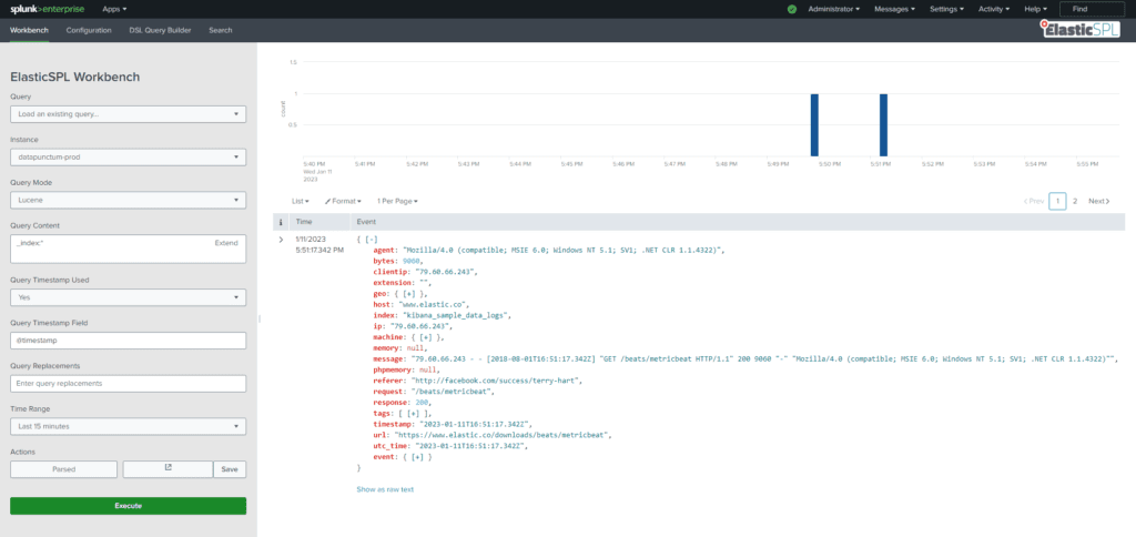 ElasticSPL is an easy-to-use integration to run queries against data residing in Elasticsearch environments. Try out our community edition, which contains one free connection.