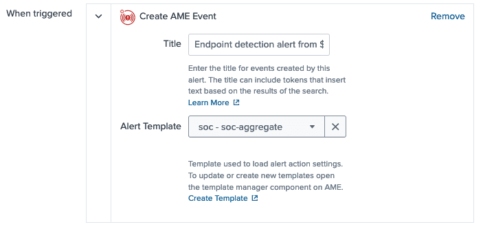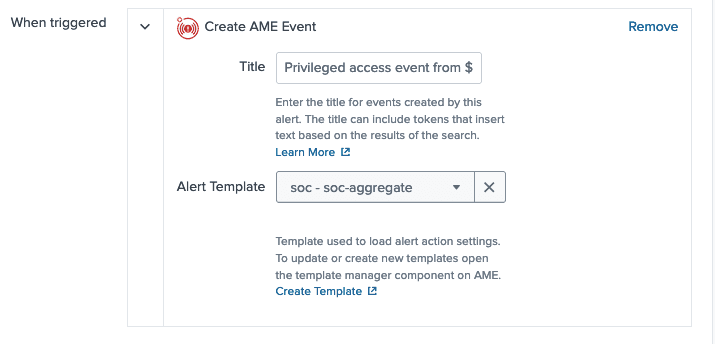 To use the aggregation, we need to set the searches that trigger the AME Alert Action to use the correct template: