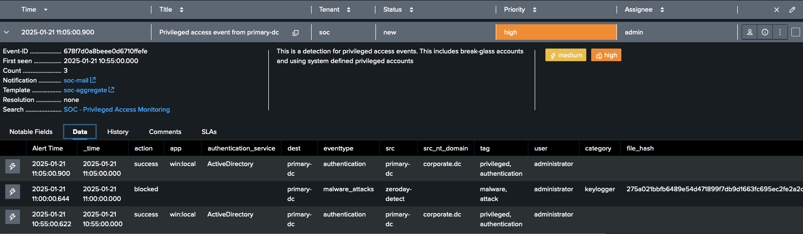 Using the aggregation functionality, the results below are grouped into a single event, showing three contributing results: two authentication events and one endpoint detection event. This consolidated view helps analysts identify patterns and act more efficiently as the context is already established.