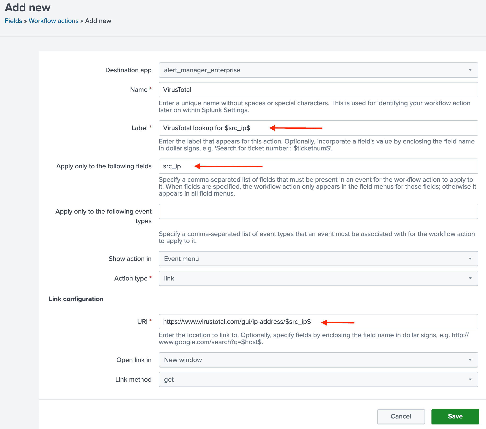 Everything about setting up workflow actions can be find in the Knowledge Manager manual: https://docs.splunk.com/Documentation/Splunk/latest/Knowledge/CreateworkflowactionsinSplunkWeb