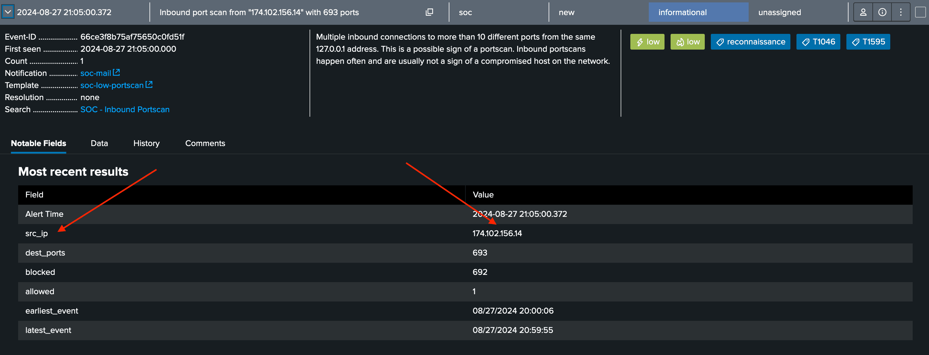In our AME instance, we will drill into an inbound port scan event. We would like to know more about the specific src_ip that is associated with this detection and we would would like to lookup this IP address in a Threat Intelligence Platform